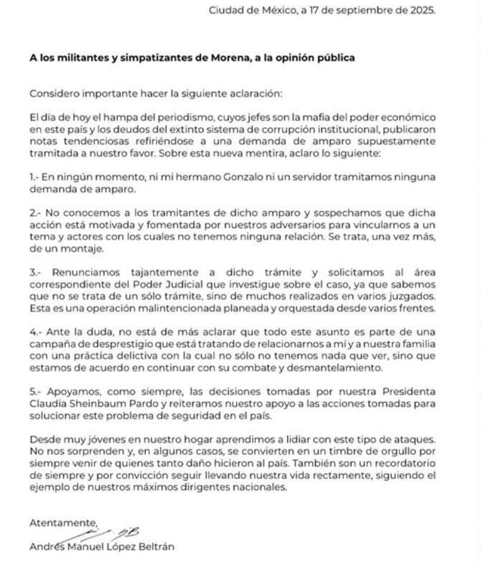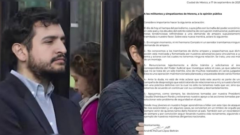 Andrés “Andy” Manuel López Beltrán, hijo del presidente Andrés Manuel López Obrador, respondió este miércoles a publicaciones que lo señalaban de promover un amparo para evitar una supuesta detención, las cuales rechazó de manera categórica.