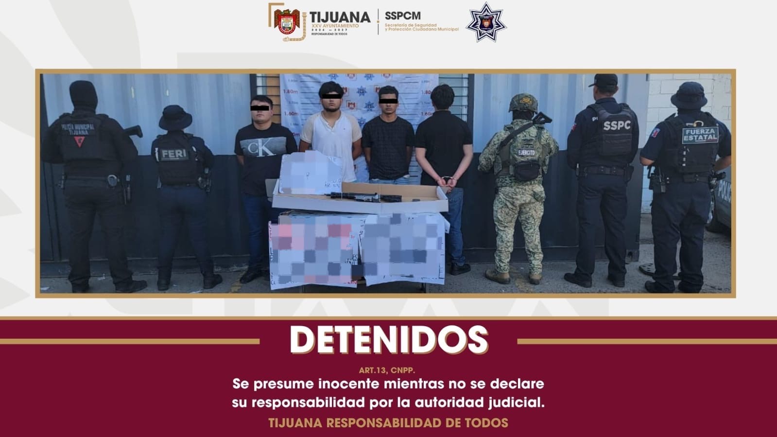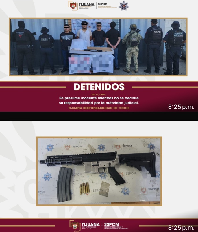 *Tijuana, Baja California a 2 de septiembre de 2025.* La Secretaría de Seguridad y Protección Ciudadana Municipal (SSPCM), en colaboración con elementos de la Secretaría de la Defensa Nacional, la Secretaría de Seguridad y Protección Ciudadana Federal (SSPCF) y de la Fuerza Estatal de Seguridad Ciudadana (FESC), llevó a cabo la detención de cuatro individuos implicados en la portación de un arma tipo fusil calibre .223, así como en la posesión de tres cartulinas que contenían amenazas dirigidas a un grupo delictivo.