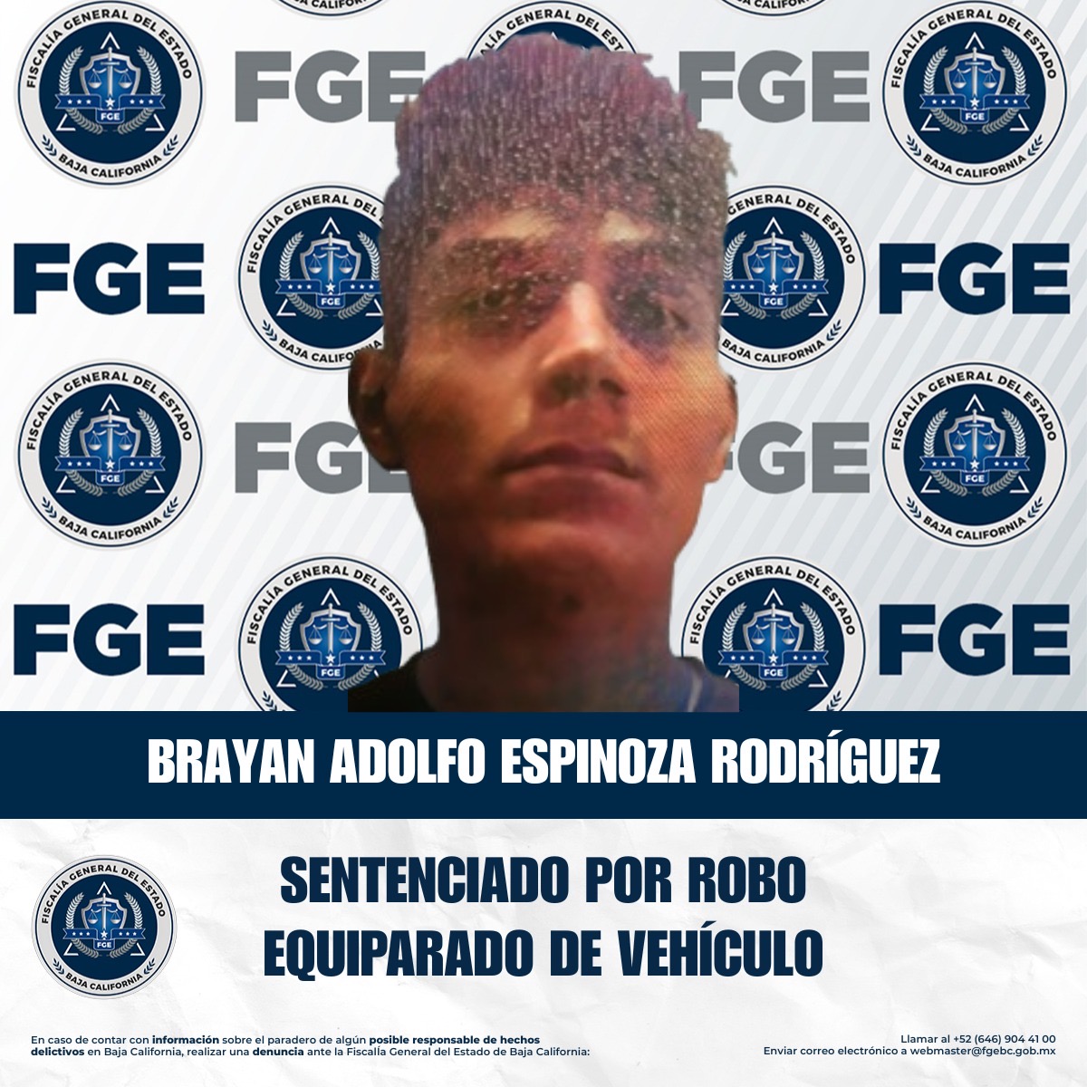 TIJUANA, BAJA CALIFORNIA, 17 DE SEPTIEMBRE DE 2025.- La Fiscalía Regional de Tijuana, a través de la Unidad de Investigación de Robo de Vehículos, Zona Tijuana, informa que se obtuvo sentencia condenatoria en contra de Brayan Adolfo Espinoza Rodríguez, por el delito de robo equiparado de vehículo de motor en su modalidad de poseer, derivado del trabajo de investigación y seguimiento realizado por esta institución.