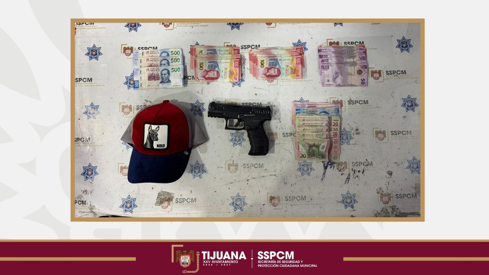 Durante la inspección preventiva se localizó un artefacto bélico tipo pistola de utilería color negro, así como la cantidad de 7 mil 400 pesos en efectivo, producto del robo cometido momentos antes.