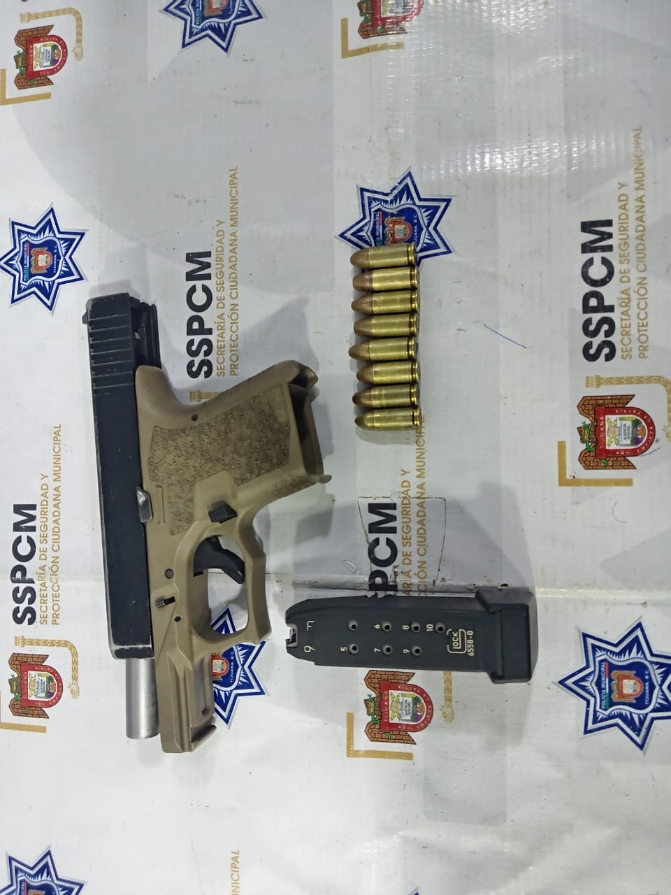 Durante la inspección, fue localizada un arma de fuego tipo pistola calibre 9 mm, con corredera negra, empuñadura café y la leyenda “PF94OSC Made in USA Polymer 80 Inc.”, así como un cargador negro con ocho cartuchos útiles.