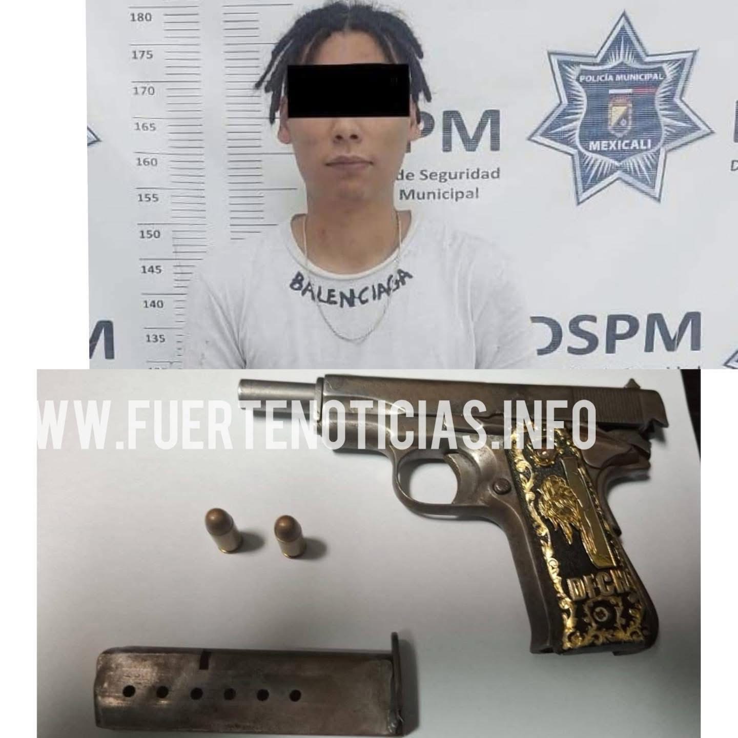 Mexicali, Baja California. — Lo que comenzó como una detención por la portación de una pistola calibre .380 con detalles dorados derivó en un caso más serio.