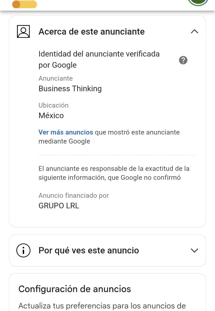 Además, la empresa encargada de la difusión de esta millonaria campaña es Business Thinking, identificada como anunciante verificada por Google y financiada por GRUPO LRL, corporación con la que vinculan a Carlos Torres y presuntamente sus socios.