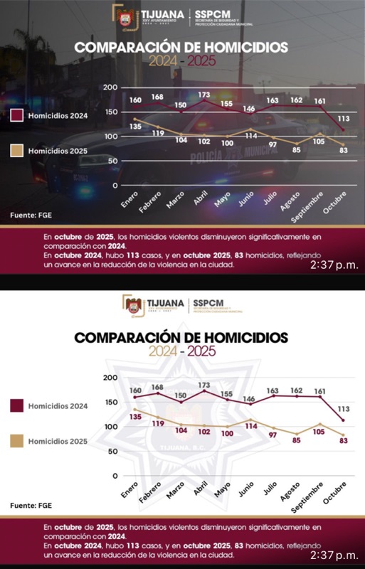 *Tijuana, Baja California a 3 de noviembre de 2025.* Resultado de las acciones en materia de seguridad implementadas por el presidente municipal Ismael Burgueño Ruiz, a través de la Secretaría de Seguridad Pública y Ciudadana Municipal (SSPCM), de acuerdo con registros preliminares, durante el mes de octubre se registraron 83 homicidios, 30 menos en el mismo periodo, pero del año 2024.