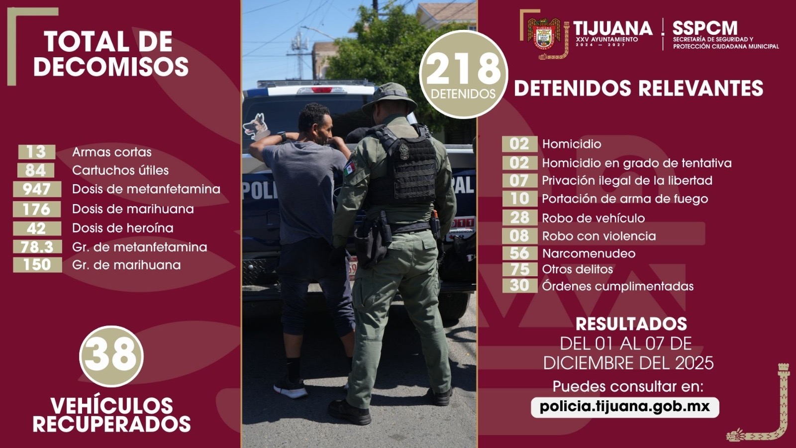 *Tijuana, Baja California a 8 de diciembre de 2025.* La Secretaría de Seguridad y Protección Ciudadana Municipal (SSPCM) informa que, como parte del fortalecimiento del operativo preventivo, elementos de la Policía Municipal realizaron la detención de 218 personas durante la semana del 1 al 7 de diciembre, derivado de los patrullajes y acciones estratégicas desplegadas en zonas prioritarias de la ciudad.