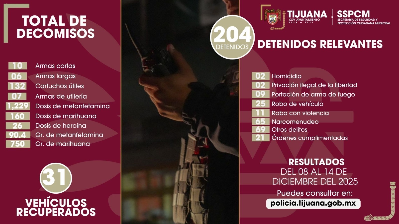 *Tijuana, Baja California a 15 de diciembre de 2025.* La Secretaría de Seguridad y Protección Ciudadana Municipal (SSPCM) llevó a cabo una destacada operación durante el periodo del 8 al 14 de diciembre, logrando la detención de 204 personas acusadas de diversos delitos, así como el decomiso de 16 armas de fuego.