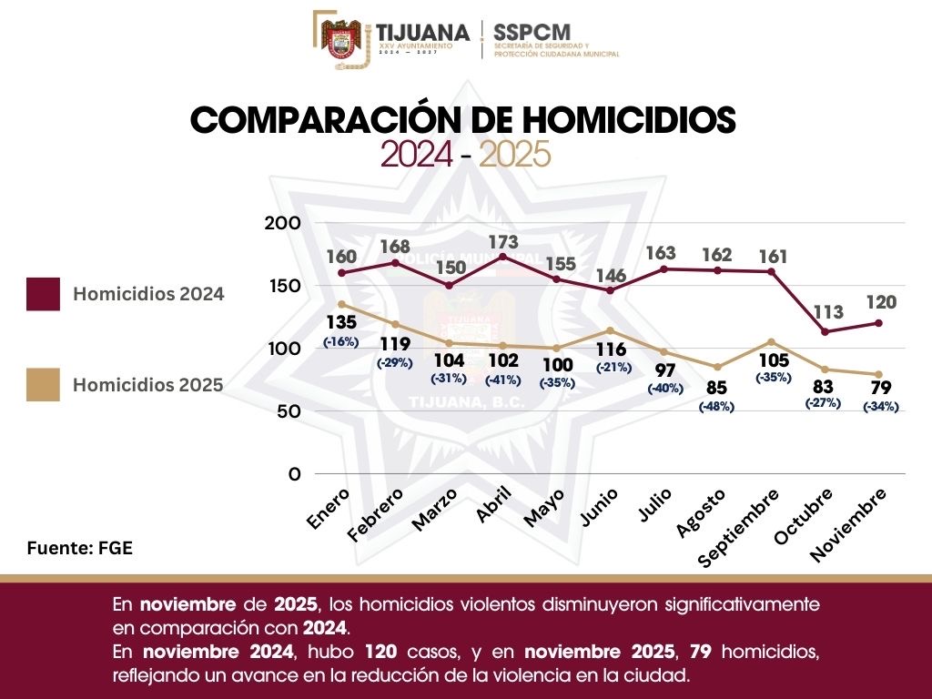 *Tijuana, Baja California a 2 de diciembre de 2025.* El esfuerzo conjunto de diversas autoridades en materia de seguridad de los tres órdenes de gobierno en Tijuana ha dado resultados positivos, logrando una disminución del 34 por ciento en el número de muertes dolosas durante el mes de noviembre, en comparación con el mismo periodo del año anterior, en términos absolutos, se pasó de 120 homicidios violentos en noviembre de 2024 a 79 en noviembre de 2025, así lo informó la Secretaría de Seguridad y Protección Ciudadana Municipal (SSPCM).