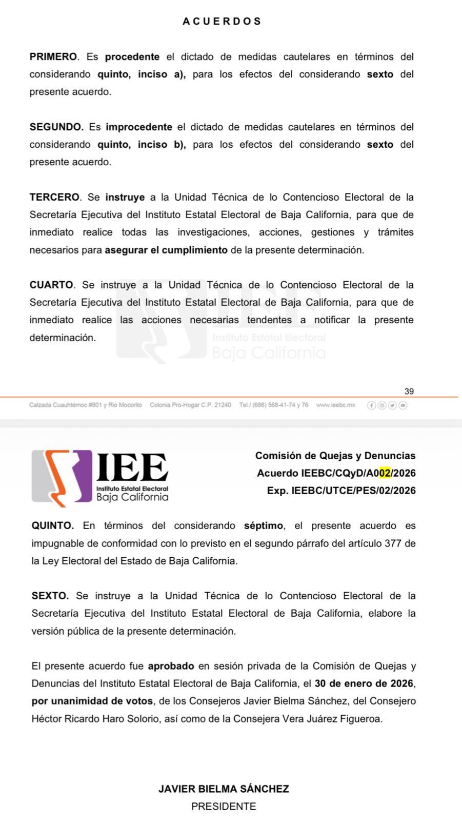 En apenas dos días se tomó un acuerdo para que sesione la Comisión de Quejas y Denuncias del Instituto Estatal Electoral de Baja California (IEEBC), con el fin de que representantes de partidos fijen postura sobre el caso.