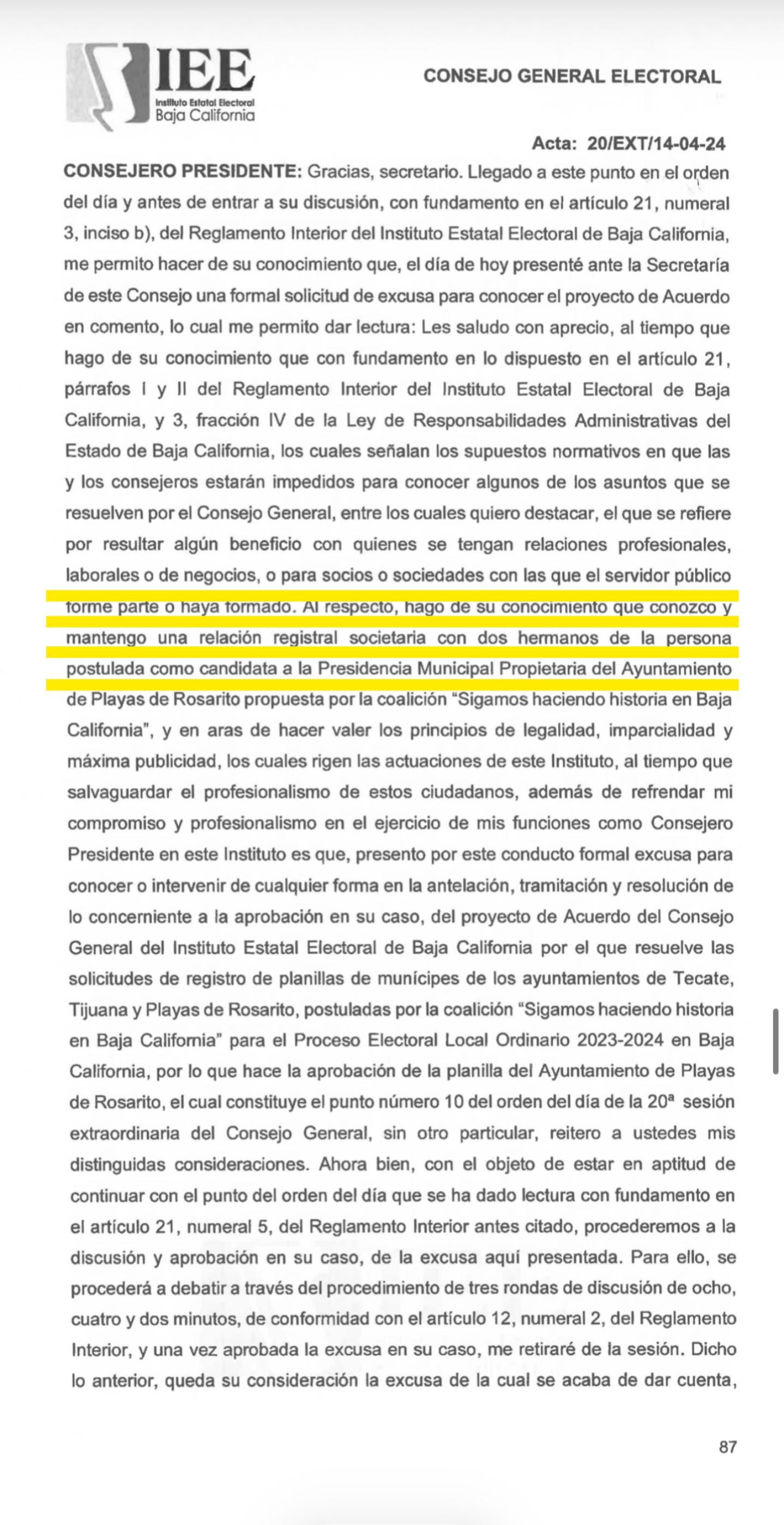 En sesión del pleno, Hernández Morales incluso se excusó de votar en la aprobación de la candidatura de Adame Muñoz, al señalar el 14 de abril de 2021: “al respecto, hago de su conocimiento que conozco y mantengo una relación registral societaria con dos hermanos de la persona postulada como candidata a la Presidencia Municipal Propietaria del Ayuntamiento de Playas de Rosarito propuesta por la coalición “Sigamos haciendo historia en Baja California””.