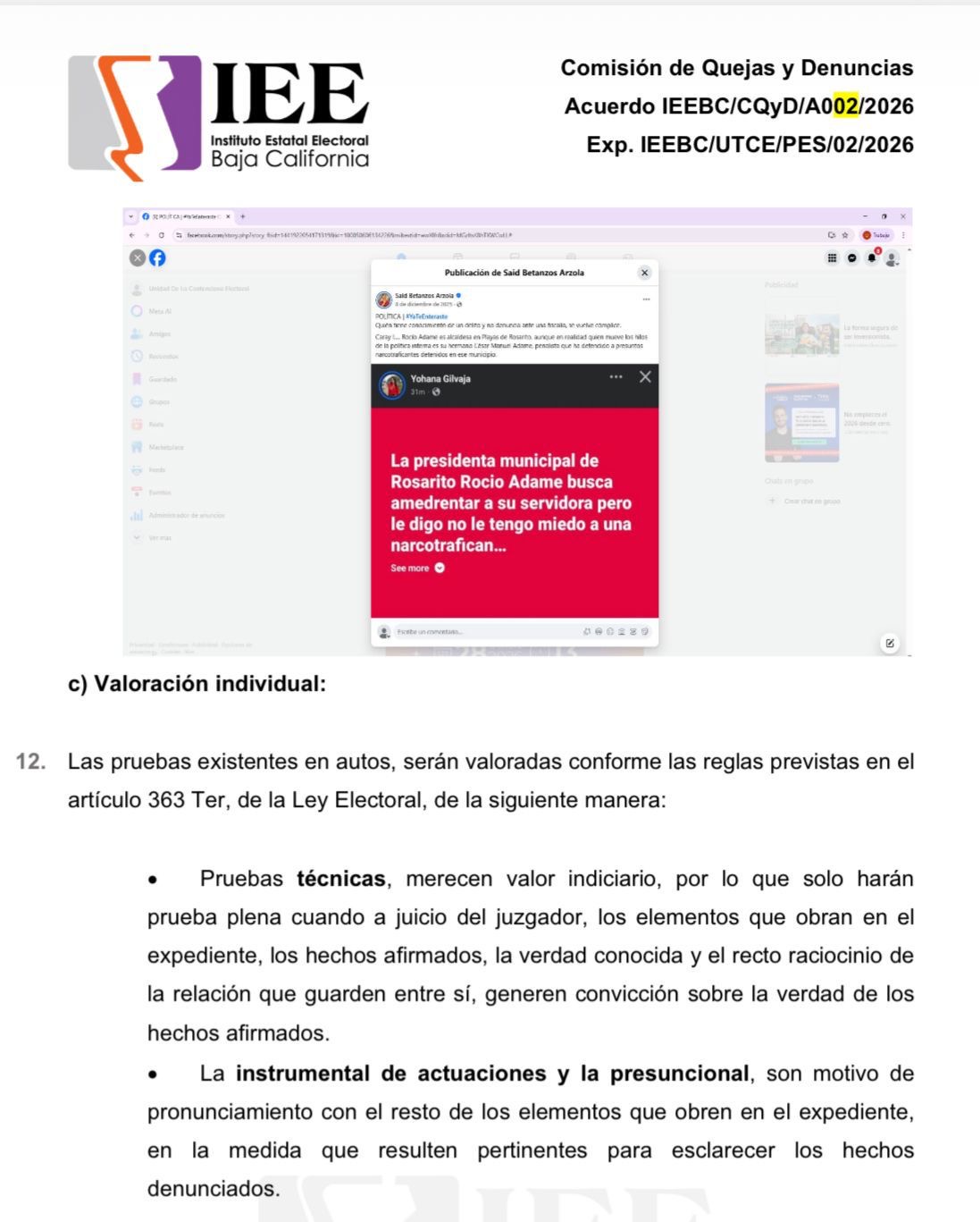 El contenido señalado en la queja es el siguiente: “Quién tiene conocimiento de un delito y no denuncia ante una fiscalía, se vuelve cómplice. Caray !…. Rocío Adame es alcaldesa en Playas de Rosarito, aunque en realidad quien mueve los hilos de la política interna es su hermano César Manuel Adame, penalista que ha defendido a presuntos narcotraficantes detenidos en ese municipio”.