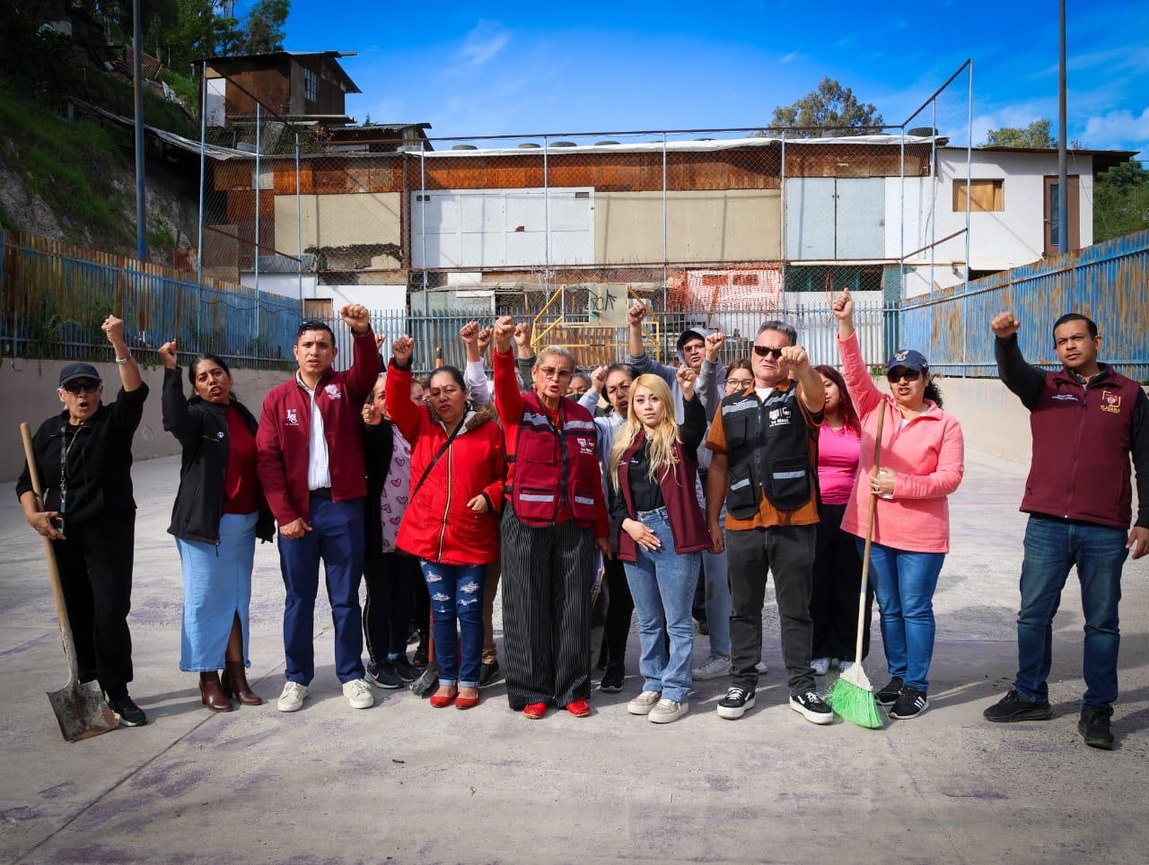 Posteriormente, en la colonia Loma Bonita, fraccionamiento Lomas Verdes, en la Delegación La Mesa, con la participación activa de vecinas y vecinos, se realizaron acciones de limpieza y mantenimiento de áreas verdes en una superficie de mil 200 metros cuadrados, poda de palmas en las inmediaciones de una cancha de usos múltiples y de un canal pluvial, pintado de juegos infantiles, así como la recolección de 1.5 toneladas de basura, impactando positivamente a mil 500 personas.