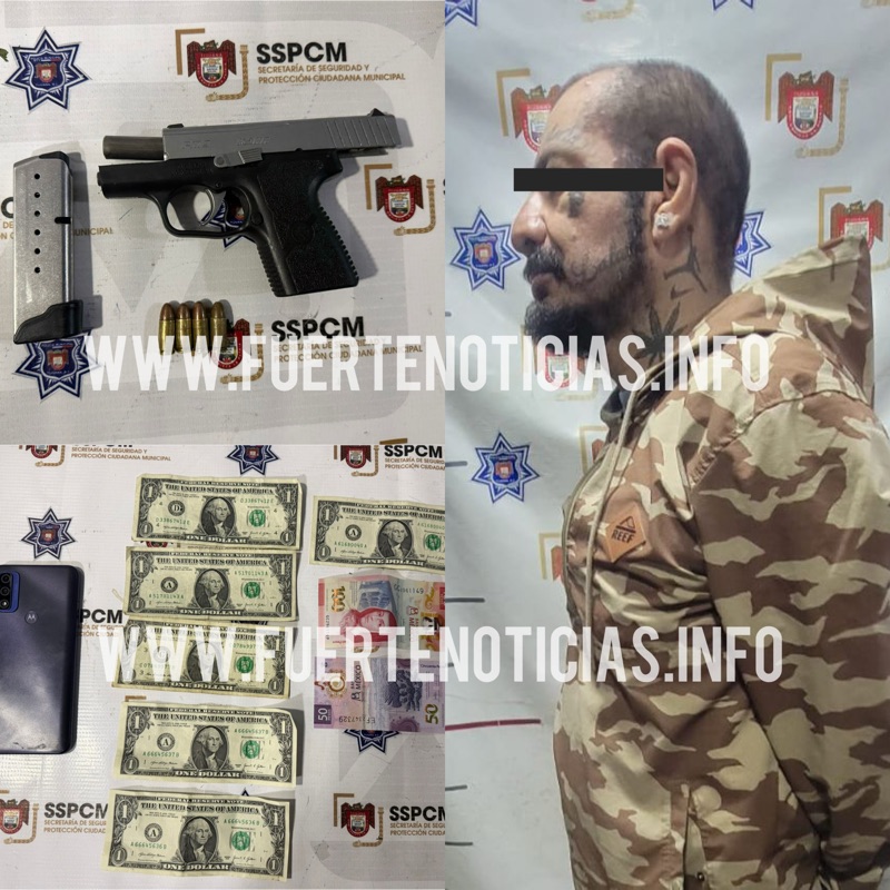 Durante la revisión preventiva, se le aseguró un objeto tipo pistola calibre 9 mm con cartuchos útiles, así como un teléfono celular marca Motorola y dinero en efectivo, tanto en moneda nacional como extranjera. La víctima reconoció plenamente al detenido y las pertenencias aseguradas.