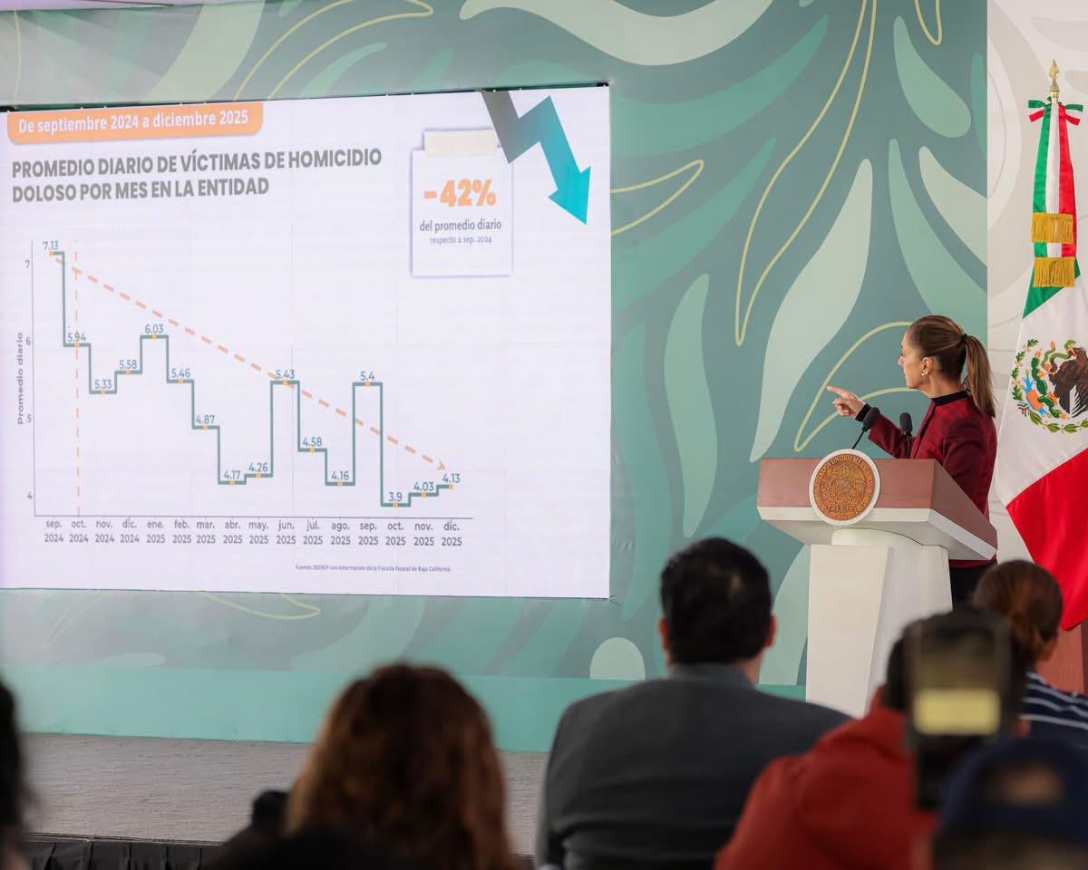 Durante la Mañanera del Pueblo, realizada en Tijuana, la presidenta Claudia Sheinbaum Pardo, destacó que en materia de seguridad el promedio diario de víctimas de homicidio doloso se redujo significativamente de septiembre de 2024 y diciembre de 2025🚔