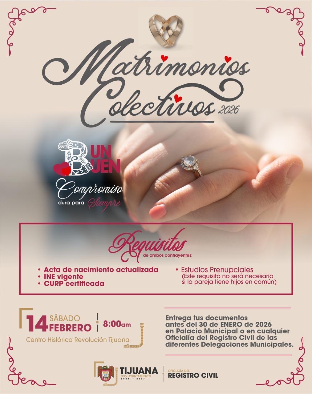 *Tijuana, Baja California, a 15 de enero de 2026.* Al corte del 15 de enero, un total de 485 parejas se encuentran inscritas en la campaña de Matrimonios Colectivos 2026 que impulsa el XXV Ayuntamiento de Tijuana, como parte de las estrategias instruidas por el presidente municipal, Ismael Burgueño Ruiz, para fomentar la formalización de la unión entre parejas y brindar certeza jurídica a las familias.