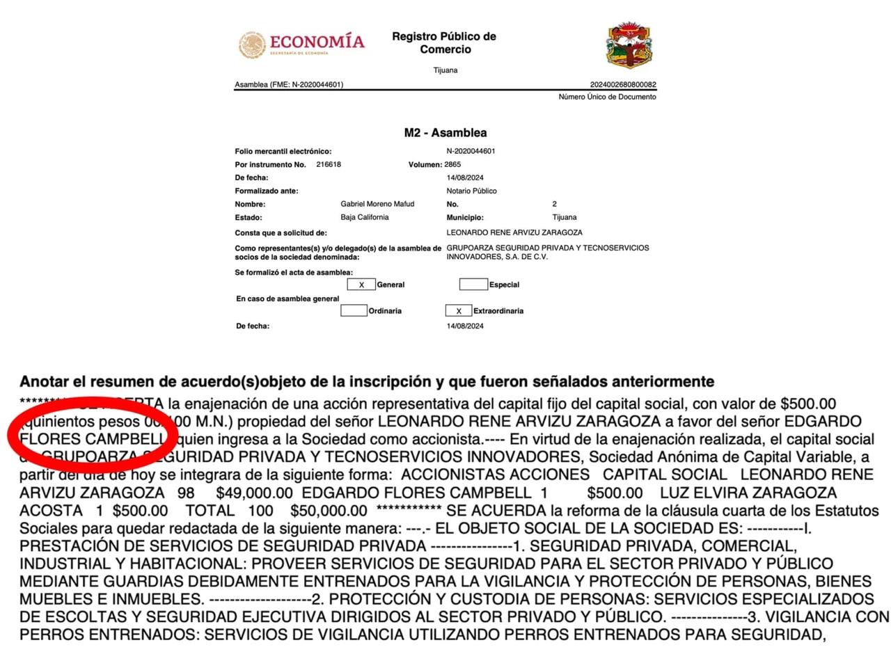 TIJUANA, BAJA CALIFORNIA, 20 DE FEBRERO DE 2026.- Contratos públicos por al menos 172 millones de pesos otorgados en 2025 a la empresa de seguridad privada Grupo Arza colocaron bajo la lupa al presidente del Comité Ciudadano de Seguridad Pública de Tijuana, Edgardo Flores Campbell, quien figura como accionista de la firma desde 2024.