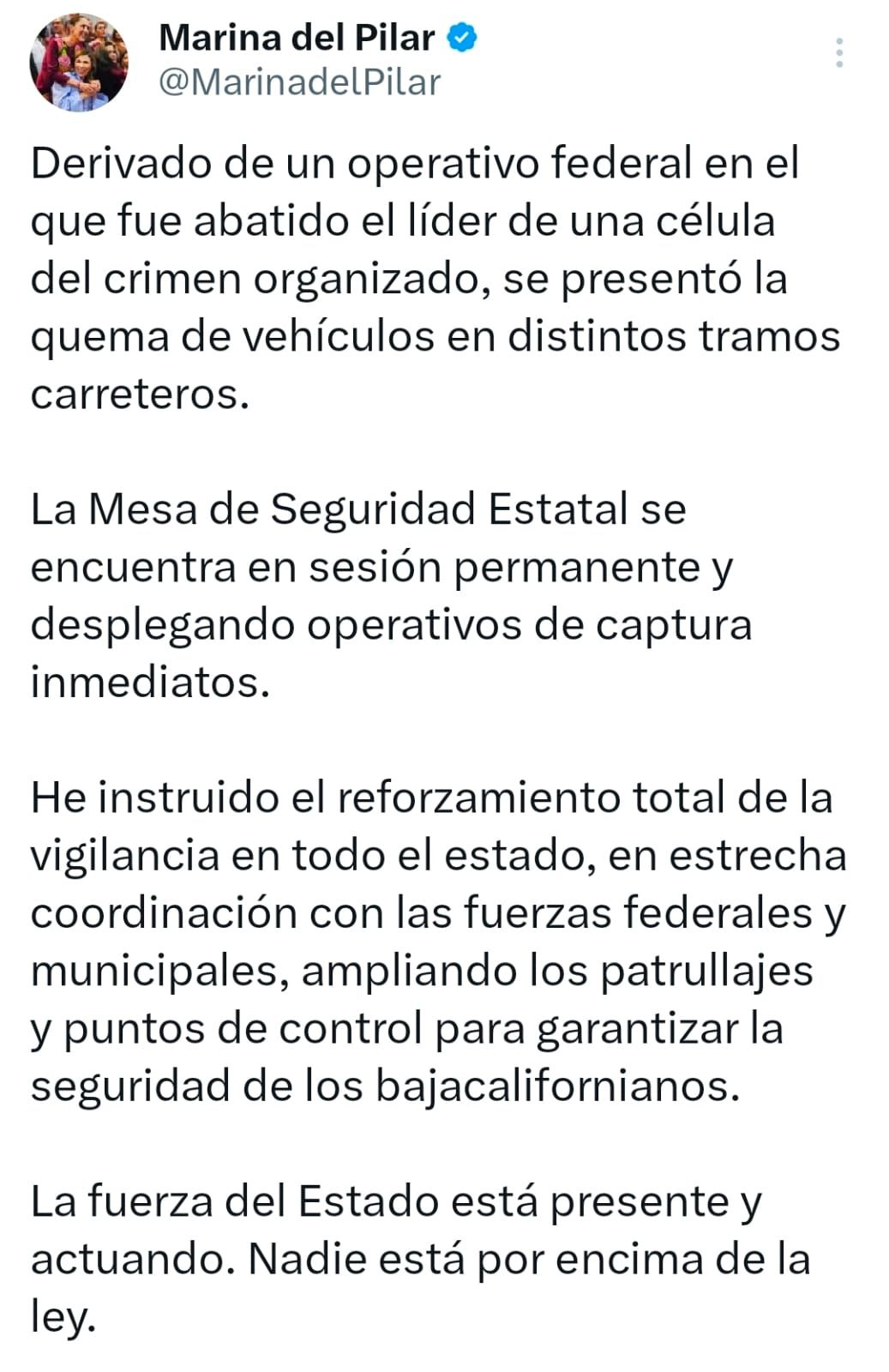 La gobernadora Marina del Pilar informó que la Mesa de Seguridad Estatal se mantiene en sesión permanente, luego de que se registraran la quema de vehículos en distintos tramos carreteros, hechos derivados de un operativo federal en el que fue abatido el líder de una célula del crimen organizado.