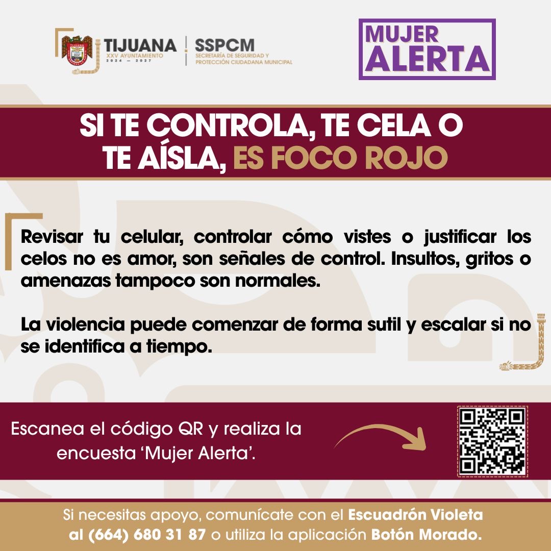 En Tijuana, la Secretaría de Seguridad y Protección Ciudadana Municipal llamó a identificar a tiempo conductas de control que pueden parecer normales al inicio de una relación, como revisar el celular sin permiso, celos constantes o limitar la convivencia con amistades y familiares.