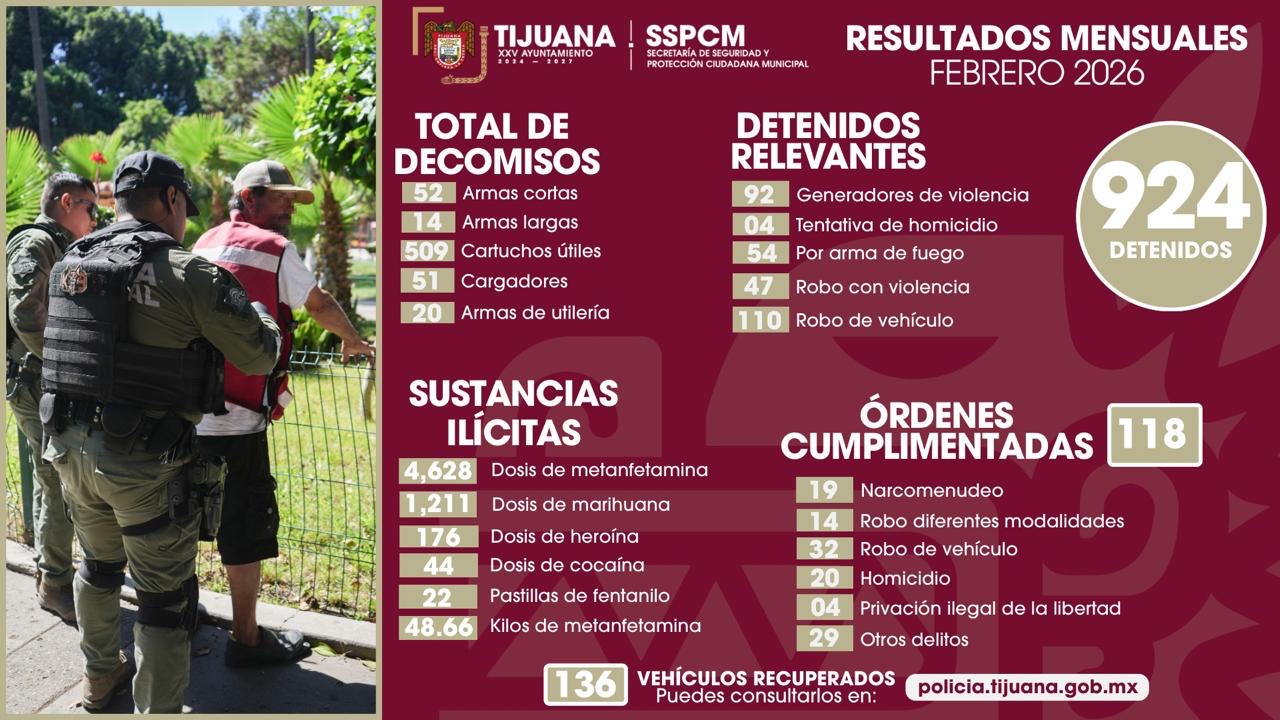 *Tijuana, Baja California a 3 de marzo de 2026.* En un esfuerzo continuo por mejorar la seguridad en la ciudad, la Secretaría de Seguridad y Protección Ciudadana Municipal (SSPCM) ha reportado cifras significativas en acciones contra el crimen durante el mes de febrero. Un total de 924 personas fueron detenidas como presuntos responsables de delitos diversos, lo que refleja el compromiso inquebrantable de la policía municipal para restablecer la paz y la tranquilidad en la comunidad.