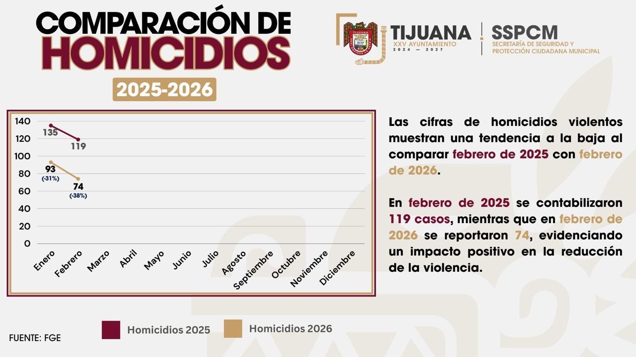 *Tijuana, Baja California, a 2 de marzo de 2026.* La Secretaría de Seguridad y Protección Ciudadana Municipal (SSPCM), informa que a través del trabajo coordinado con autoridades federales y estatales, se registró una disminución del 38 por ciento en el número de homicidios durante el mes de febrero de 2026, en comparación con el mismo periodo del año anterior.