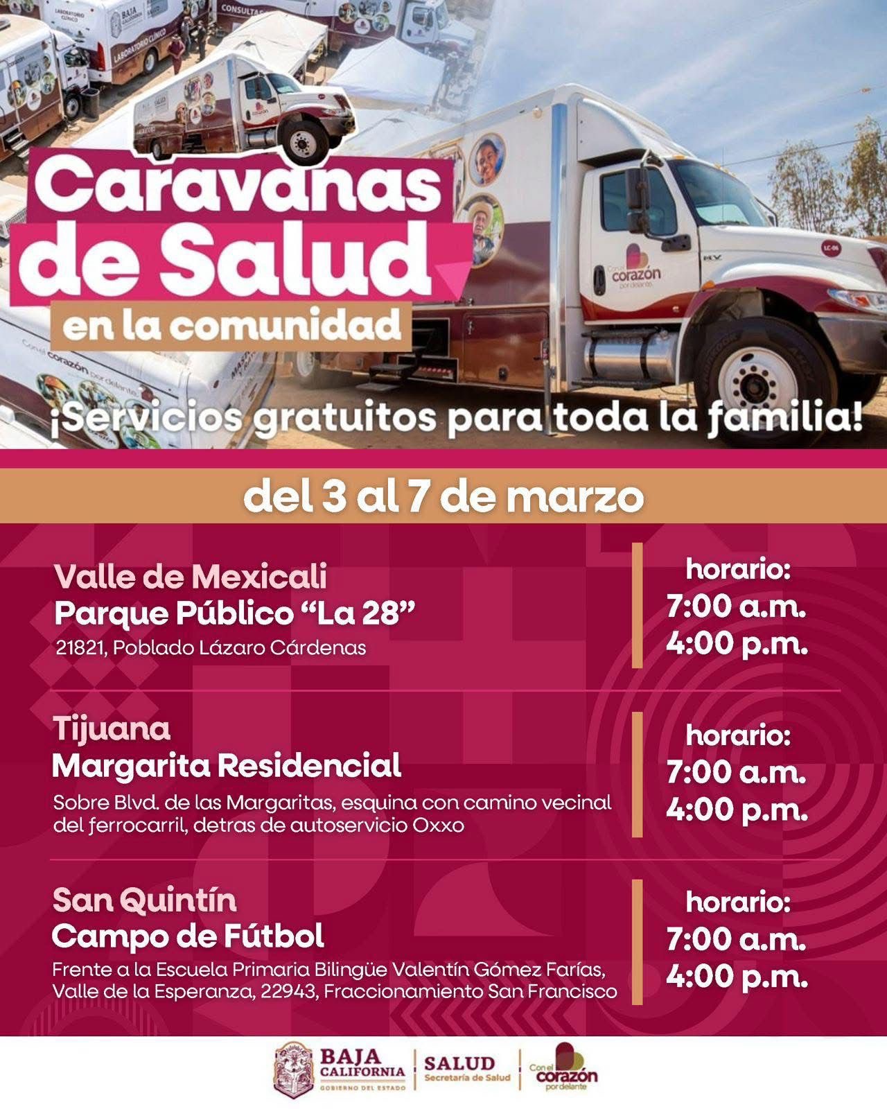 🩺 Del 3 al 7 de marzo, las Caravanas de Salud Móvil brindarán atención médica gratuita en el Valle de Mexicali, Tijuana y San Quintín, informó la gobernadora Marina del Pilar.