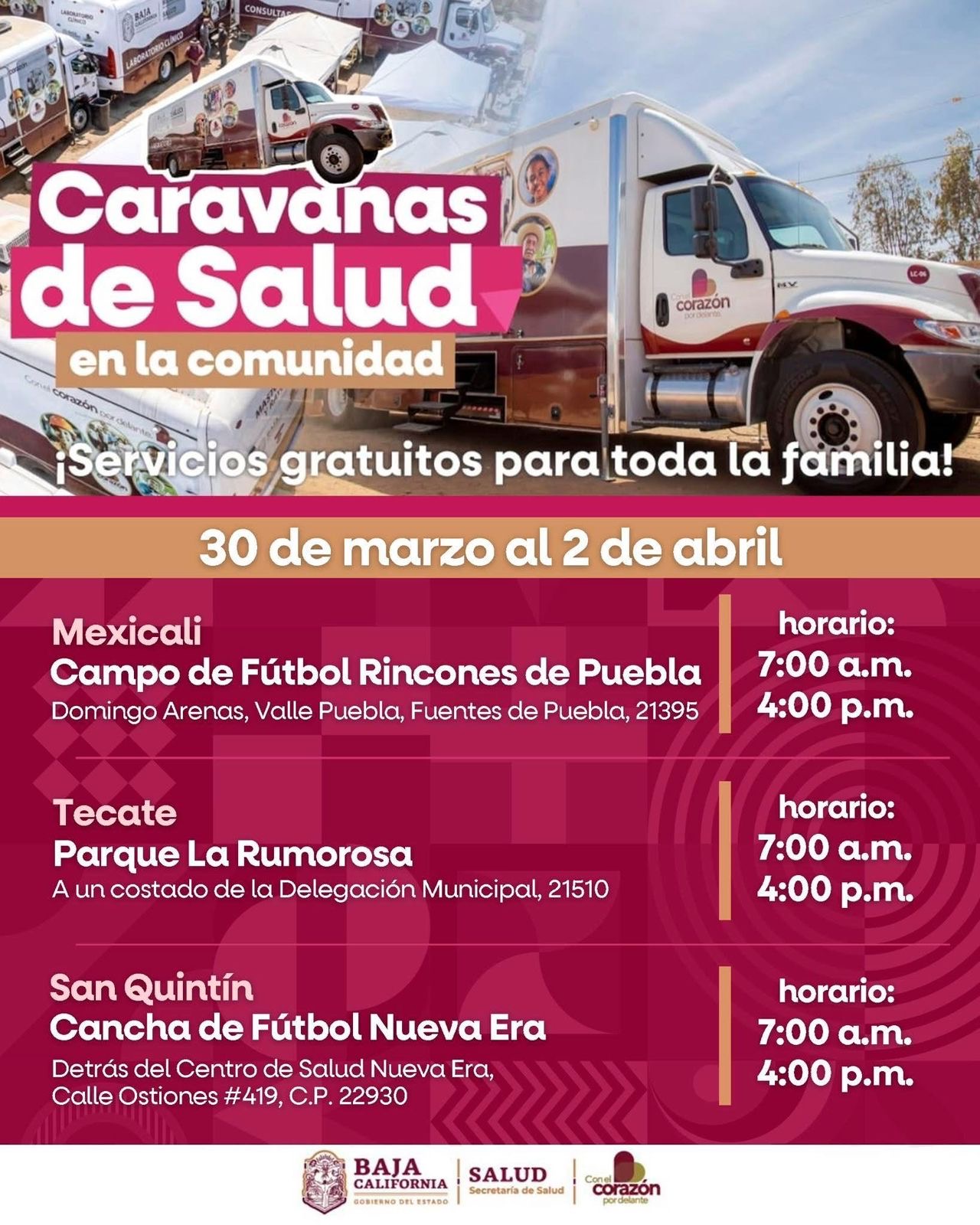 🚑 La gobernadora Marina del Pilar informó que las Caravanas de Salud Móviles estarán brindando atención médica gratuita para toda la familia en Mexicali, Tecate y San Quintín.