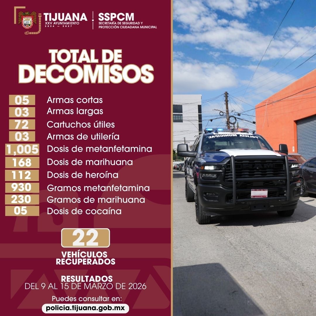 *Tijuana, Baja California, a 17 de marzo de 2026.* Como resultado de las acciones preventivas y de reacción inmediata implementadas por la Secretaría de Seguridad y Protección Ciudadana Municipal (SSPCM), durante la semana del 9 al 15 de marzo se obtuvieron resultados en el combate a la delincuencia, destacando el decomiso de ocho armas de fuego, así como diversas cantidades de sustancias ilícitas.
