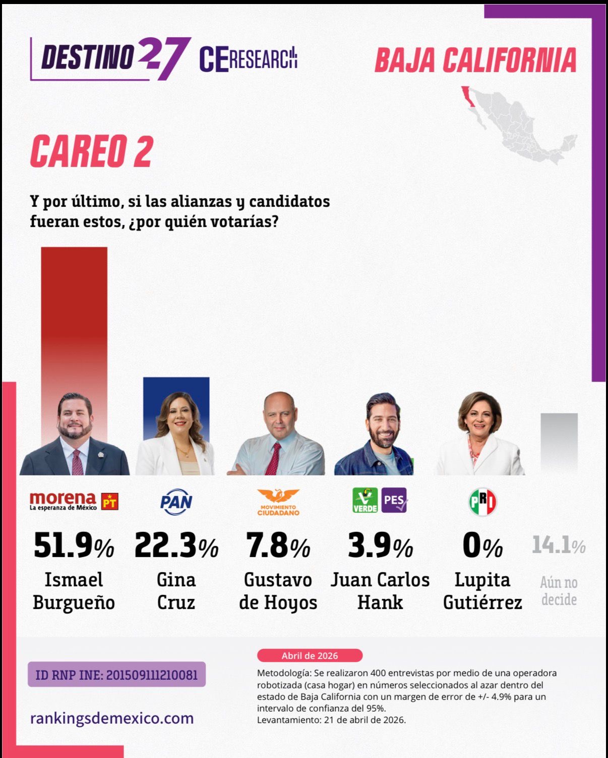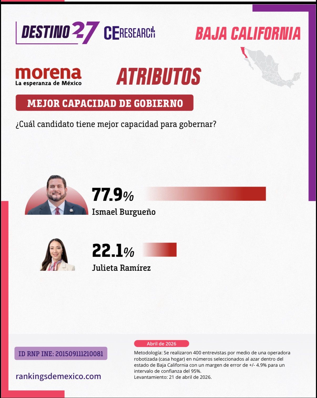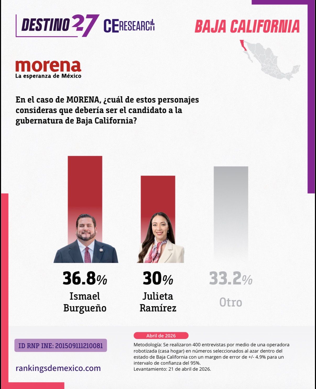 Tijuana, Baja California, a 22 de abril de 2026.- El alcalde de Tijuana, Ismael Burgueño Ruiz, se posiciona como el perfil más sólido de MORENA rumbo a la gubernatura de Baja California en 2027, al encabezar los principales indicadores de percepción y preferencia electoral en la encuesta estatal “Destino 27”, levantada en abril de 2026 por la casa encuestadora C&E RESEARCH.